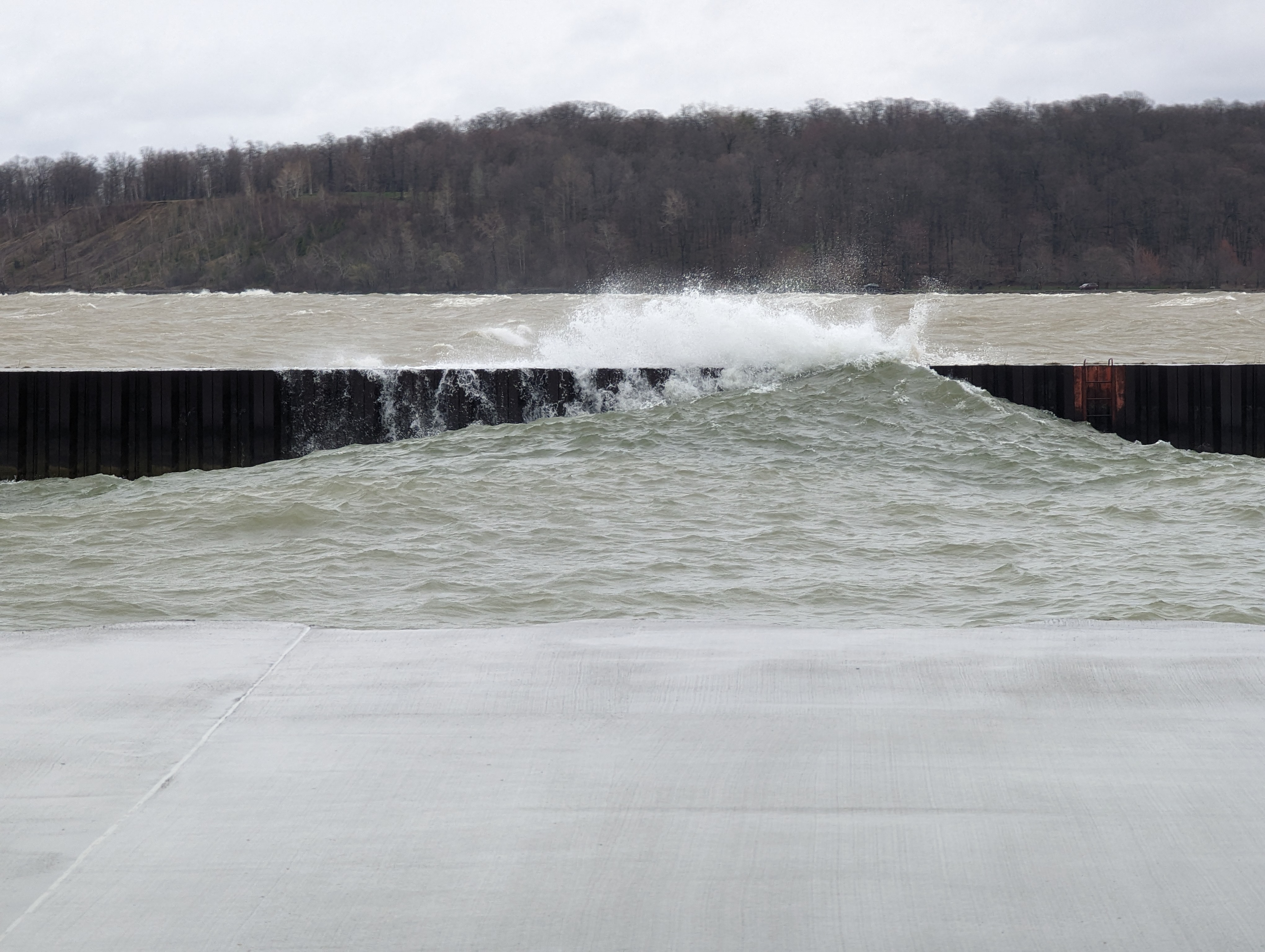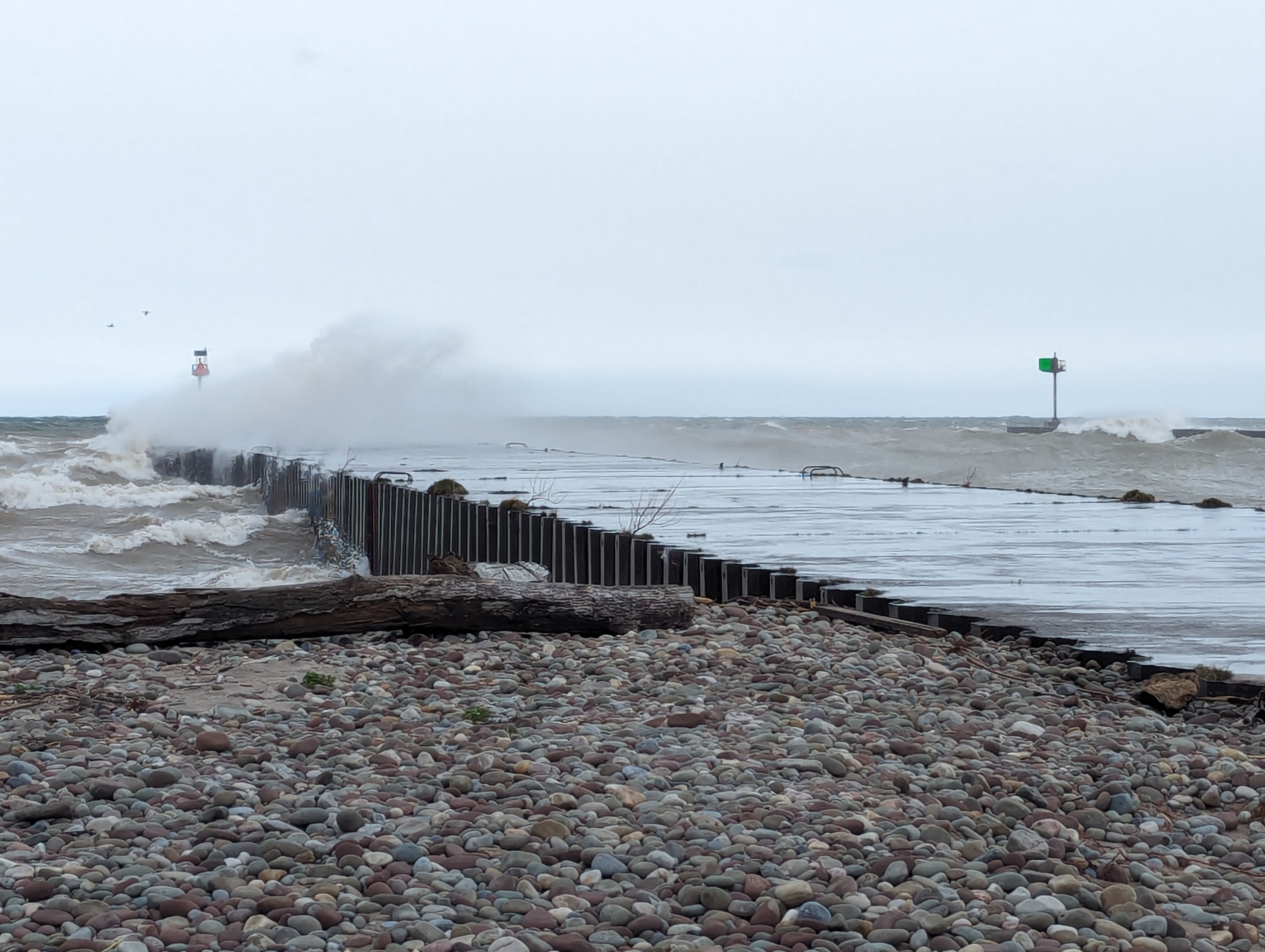 eleven foot waves and forty mph west winds putting on a good show up at the West Side Park today. Also dozens of tree swallows apparently feeding at inner end of channel. I assume a midge hatch must have been underway? Not ideal conditions for the insects but the swallows were very busy.